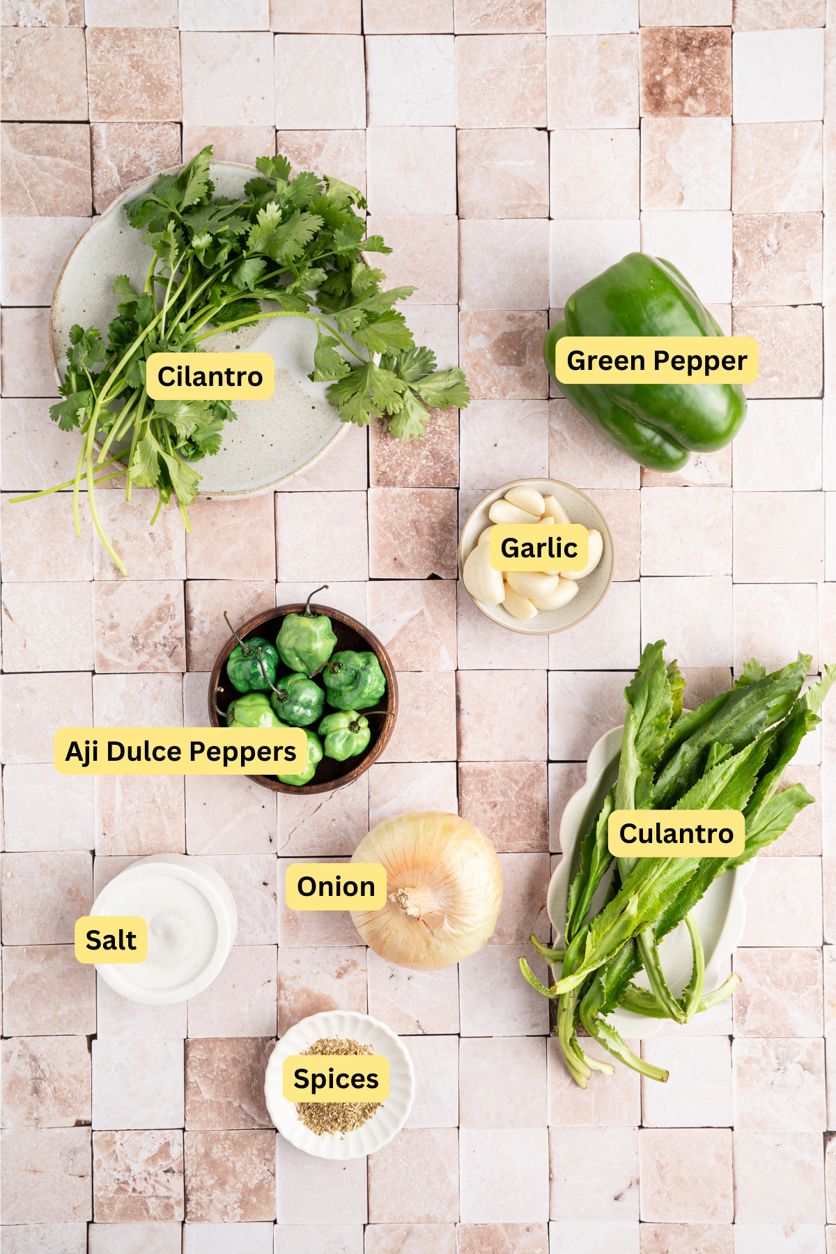 - In a blender or food processor, combine the cilantro, culantro, chopped onion, ají dulce peppers, green bell pepper, garlic, oregano, and salt.