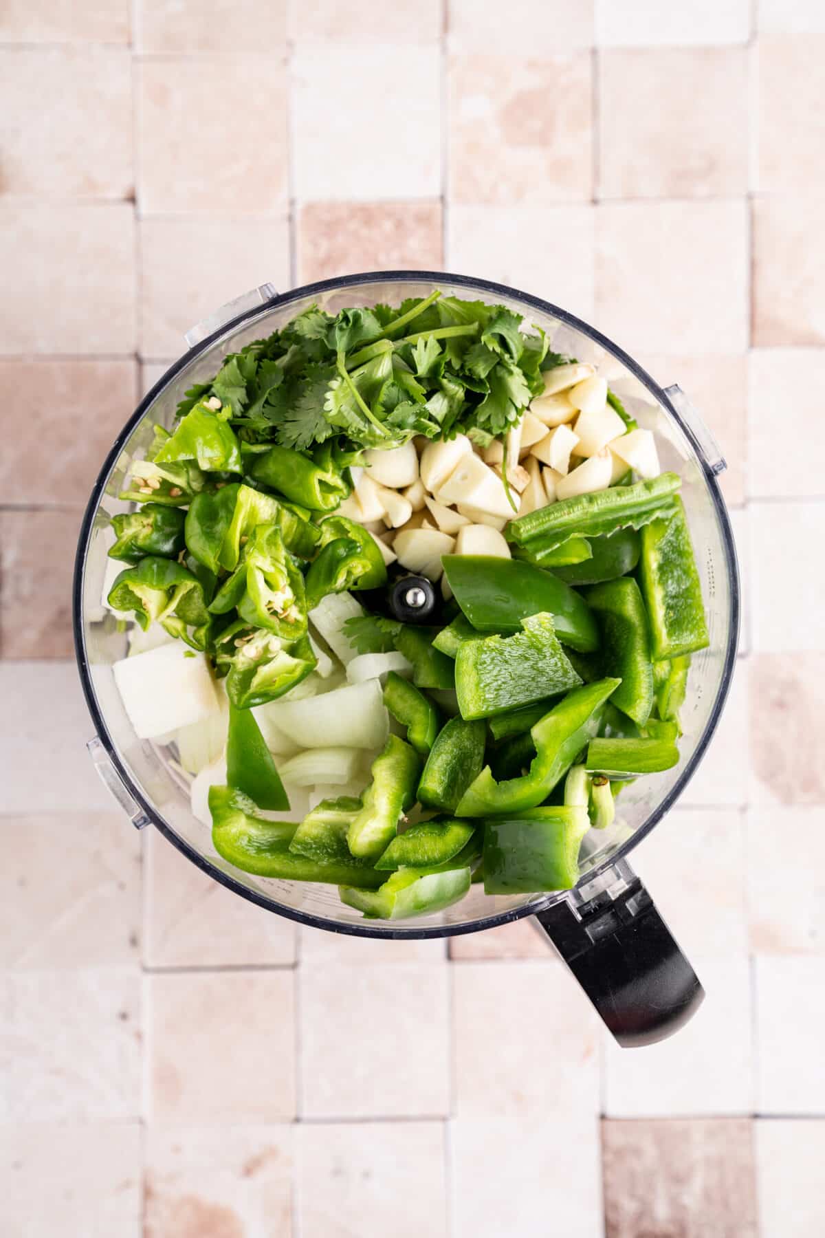 Prepare the vegetables: Roughly chop the onion, peppers, and herbs so they blend easily.